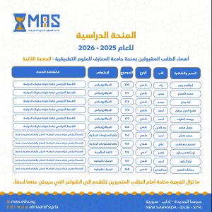المنحة الدراسية للعام 2025 – 2026 أسماء الطلاب المقبولين بمنحة جامعة المعارف للعلوم التطبيقية – الدفعة الثانية